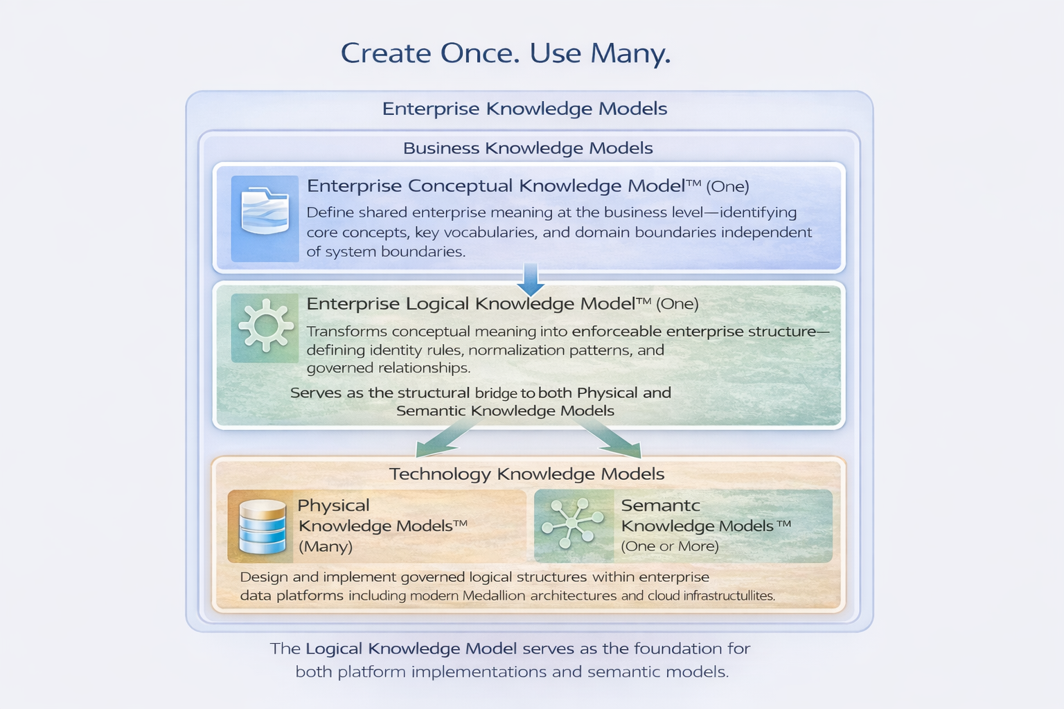 This program teaches professionals how to design Enterprise Knowledge Models™ — durable structural blueprints that unify governance, Medallion architectures, analytics platforms, and AI ecosystems.
